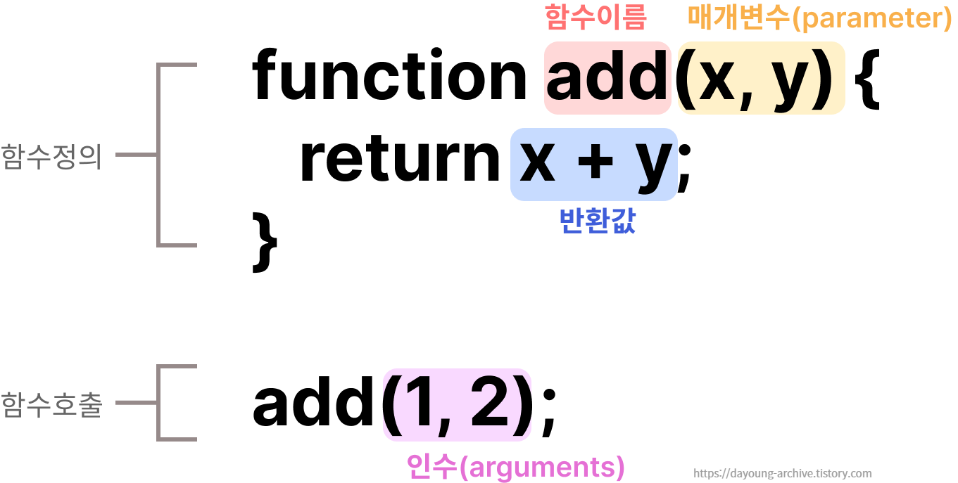 let add = (a, b) => a + b; // (중괄호없이 쓰는 화살표 함수)