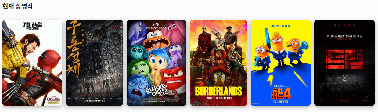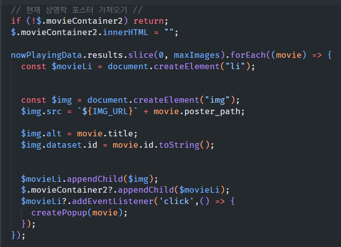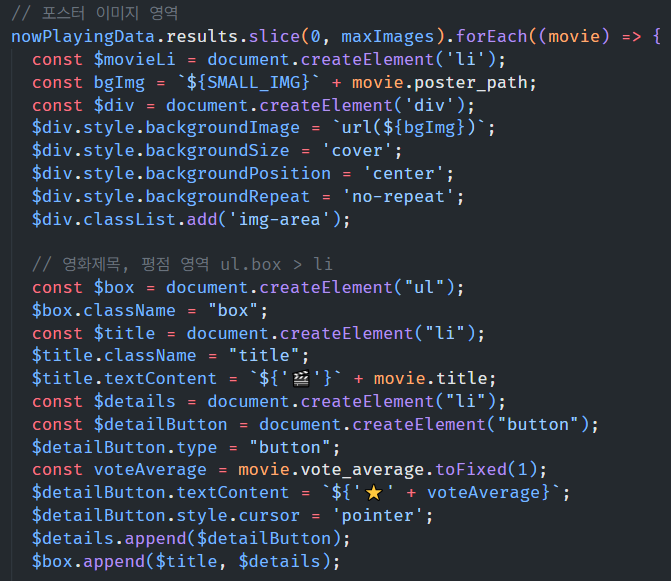 강사님과 팀원들의 도움으로..💗 JS에서 뎁스를 구성하는 방법을 배웠고, 그 결과 홈 화면에서는 영화제목+추가정보를 보여주는 원래의 마크업 형태처럼 구현할 수 있었다.
