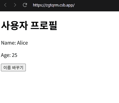 (예시용이니 간단하게 사용자 이름, 나이를 표시하고 이름 바꾸기 버튼을 클릭하면 사용자 이름이 바뀌도록 만들어 둠)